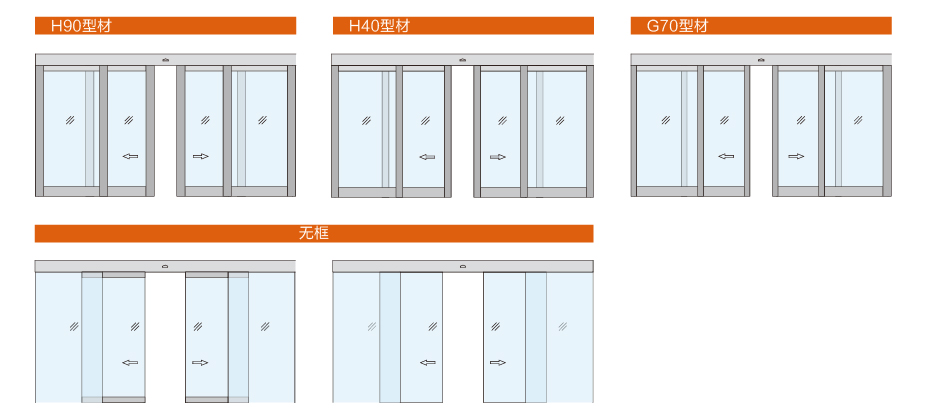 GS601/GS603/GS6011/GS6012自動平滑門為滿足客戶的各種定制需求設置了不同風格的門體造型。