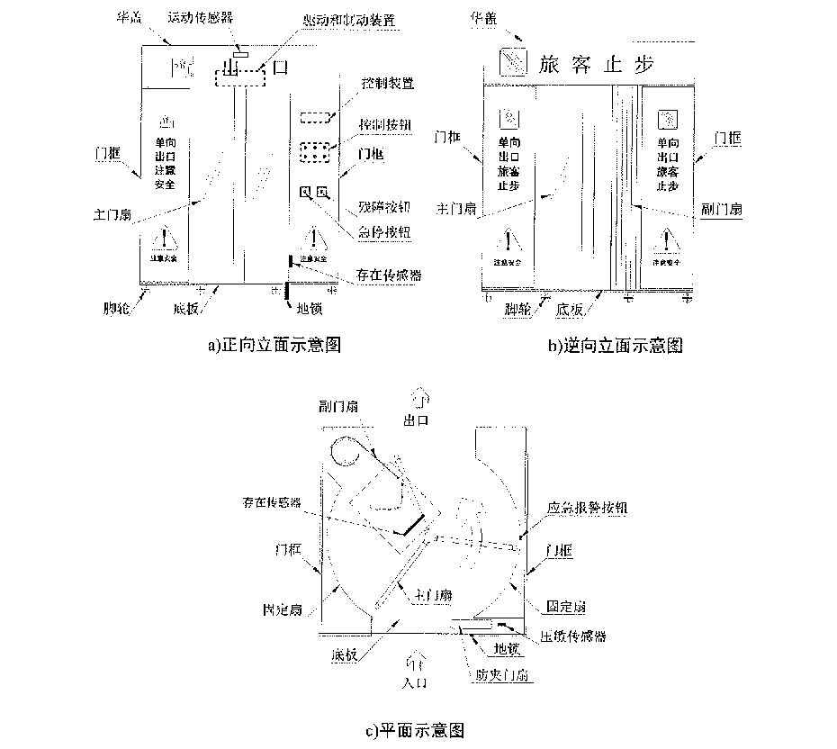 主門(mén)扇與副門(mén)扇之間的恒定間隙應(yīng)確保旅客無(wú)法逆向通行。旅客和物體試圖逆向通行時(shí)會(huì)觸發(fā)存在傳感器,主門(mén)扇立即制動(dòng),單向旋轉(zhuǎn)門(mén)停止運(yùn)行并發(fā)出警報(bào)提示。旅客和物體撤出后,單向旋轉(zhuǎn)門(mén)應(yīng)能自動(dòng)恢復(fù)正常運(yùn)行。
