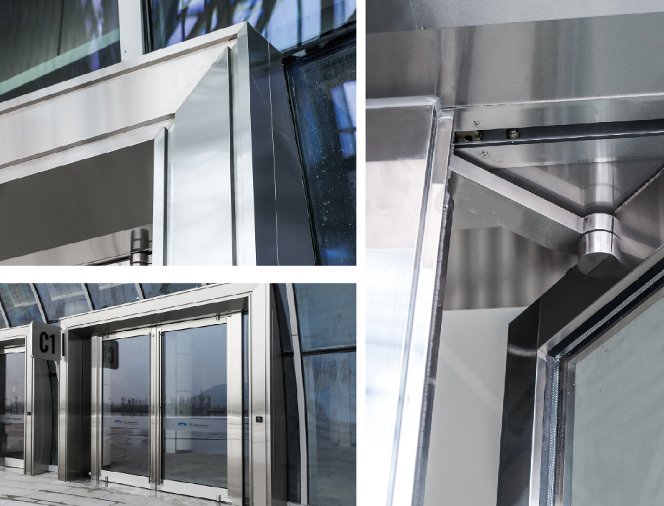 所有外露五金件 均采用高精度打磨的316/304不銹鋼零件,門體表面則采用氟碳噴涂或不銹鋼包飾處理。